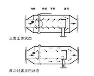 手 動(dòng)蝶閥關(guān)閉,即閥板平面與筒體軸線垂直,(此時(shí)扳手旋轉(zhuǎn)90度與筒體軸線垂直),開啟排污閥,此時(shí)水流從進(jìn)口進(jìn)入過濾網(wǎng)筒前端,因蝶閥關(guān)閉,水流被閥板擋住,只能從前端網(wǎng)孔進(jìn)入濾筒外側(cè),大部分從出口流出,而由于排污口打開,濾筒后段水排出后壓力降低,故一部分水又從過濾器后段的網(wǎng)孔反沖入網(wǎng)筒內(nèi),從而達(dá) 到從濾網(wǎng)外部沖洗粘附在網(wǎng)筒內(nèi)壁上雜質(zhì)的目的,雜質(zhì)及污水從排污口排出。
