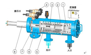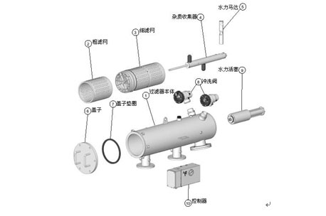 水力驅(qū)動自清洗過濾器由主管組件、端蓋組件、細(xì)濾芯組件、粗濾芯組件、吸污器組件、水力馬達、水力缸組件、排污閥、管路控制系統(tǒng)等主要零部件組成。水由入水 口進入過濾器,首先經(jīng)過粗濾芯組件濾掉圈套顆粒的雜質(zhì),然后到達細(xì)濾網(wǎng),通過細(xì)濾網(wǎng)濾除細(xì)小顆粒的雜質(zhì)后,清水由出水口排出。